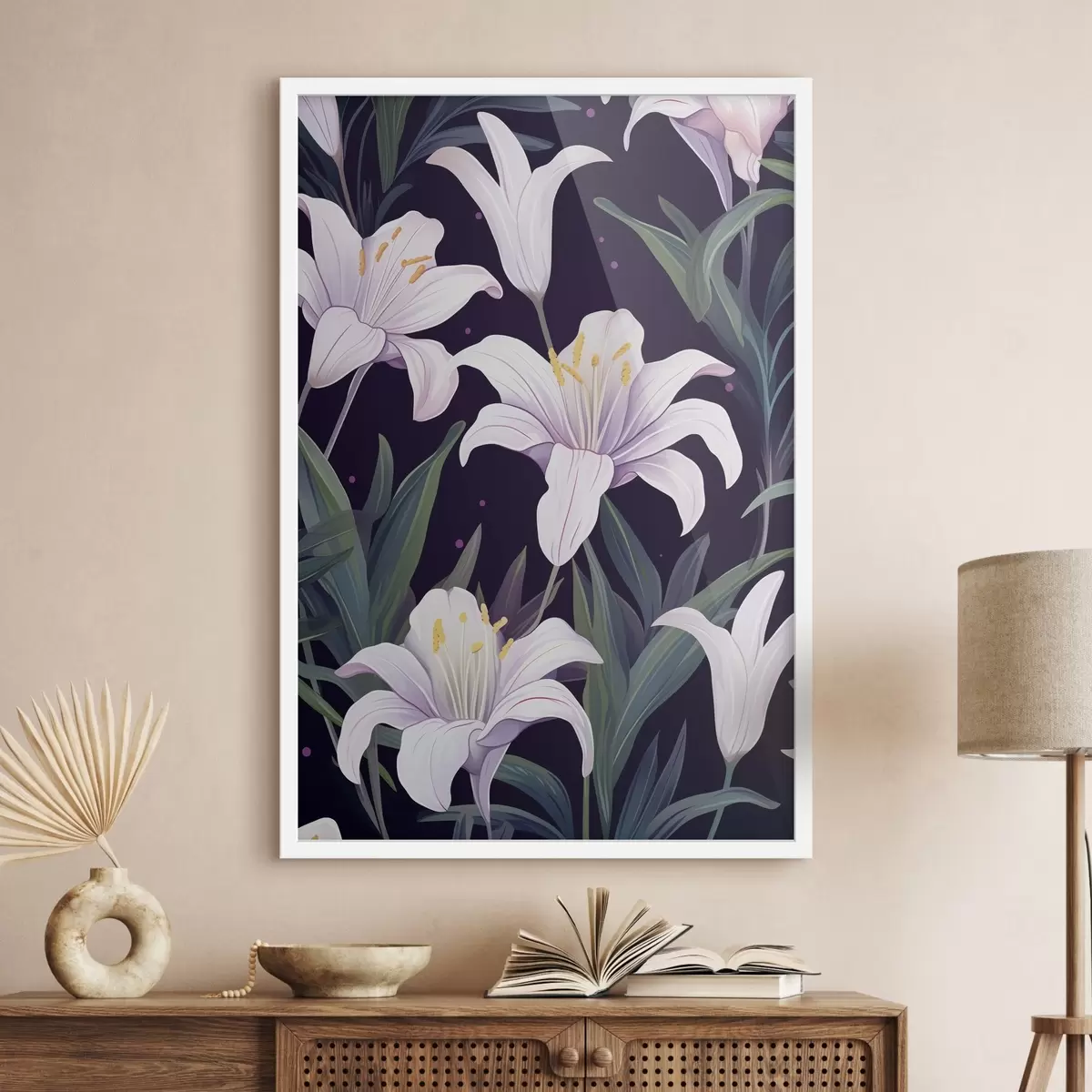 Poster Zarte Lilien auf dunklem Hintergrund mit grünen Blättern Nr f45697