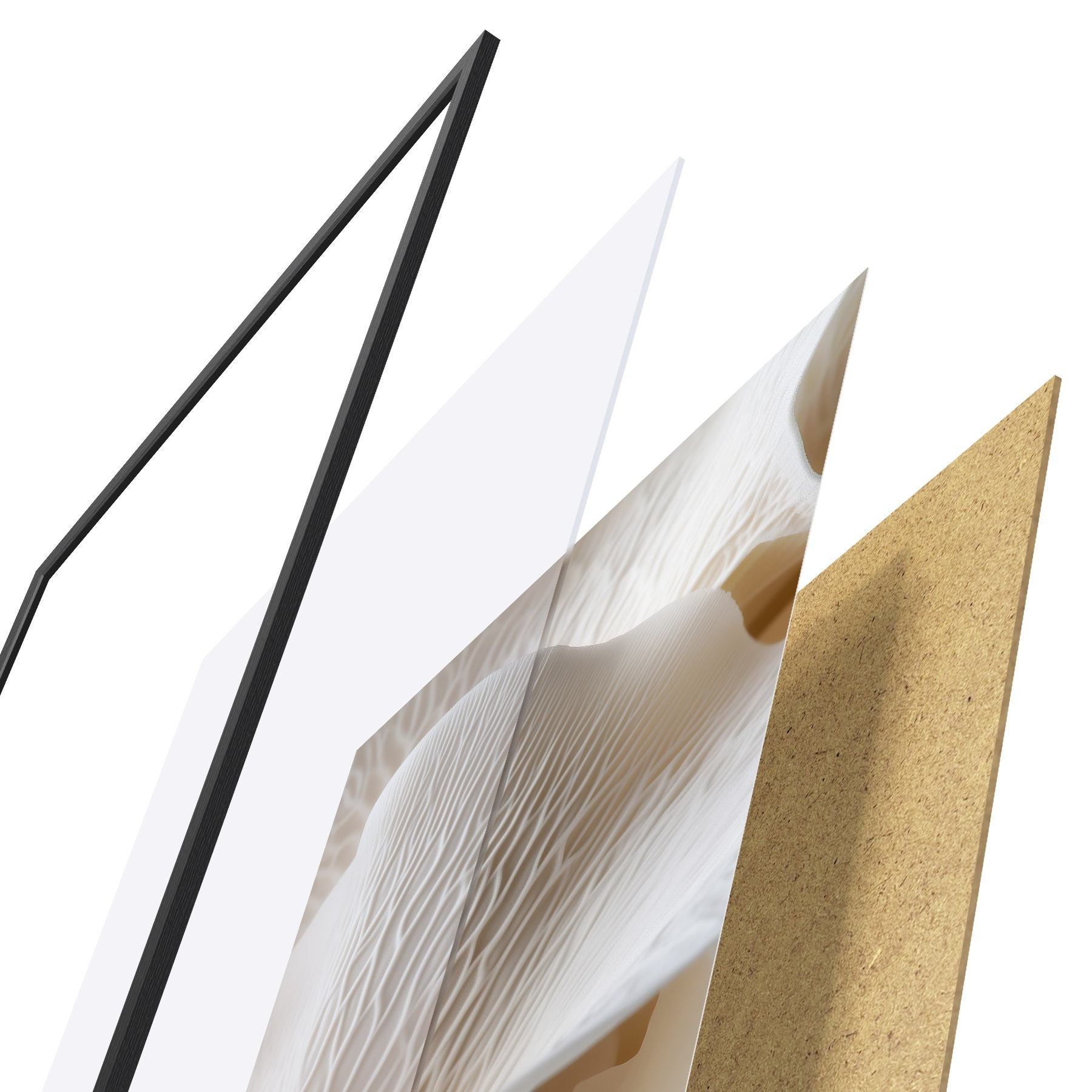 Das Poster besteht aus einem Rahmen, Plexiglas, einem gedruckten Bild und einer Rückwand aus Spanplatten. Dank der Halterungen auf der Rückseite kann das Poster sofort an die Wand gehängt werden.