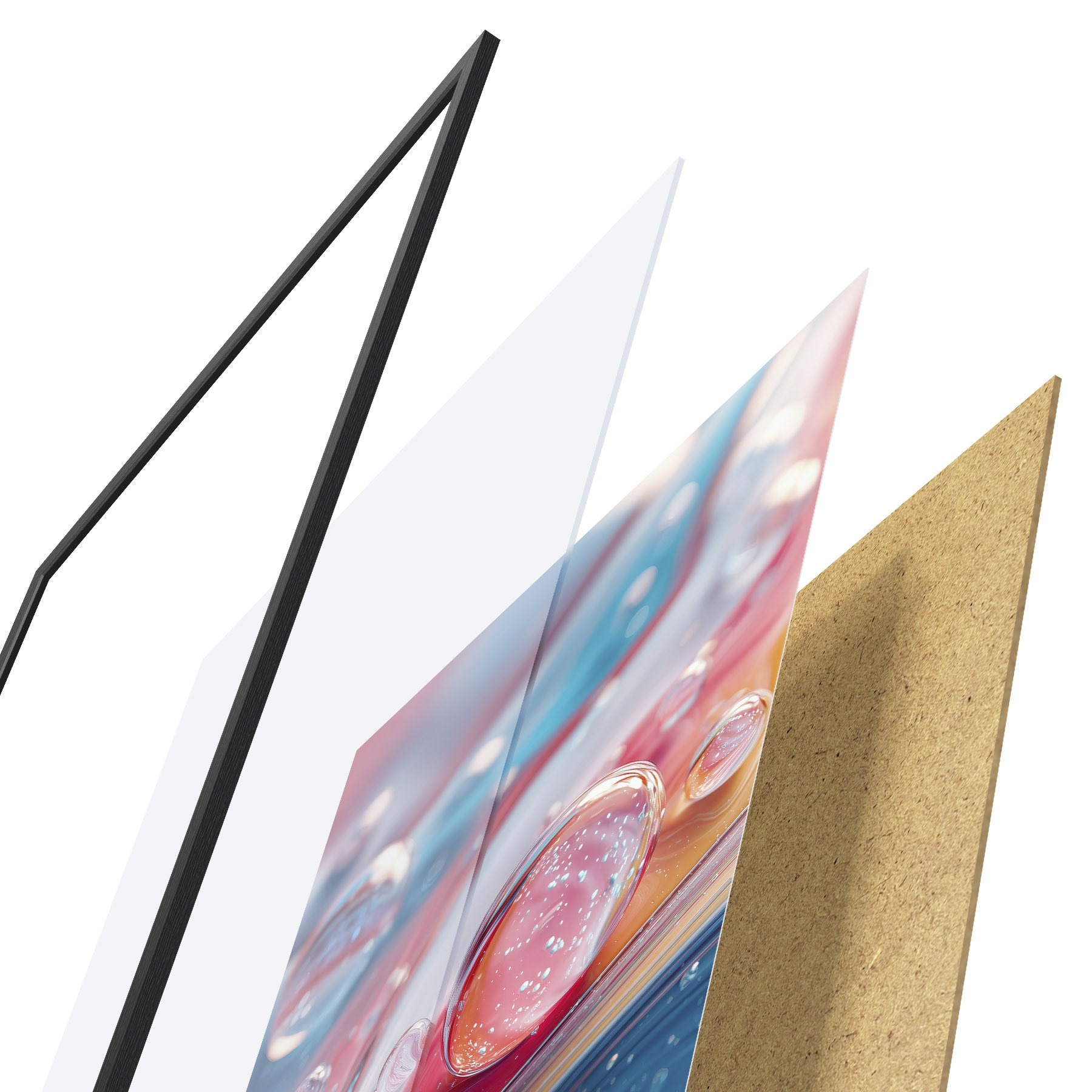 Das Poster besteht aus einem Rahmen, Plexiglas, einem gedruckten Bild und einer Rückwand aus Spanplatten. Dank der Halterungen auf der Rückseite kann das Poster sofort an die Wand gehängt werden.