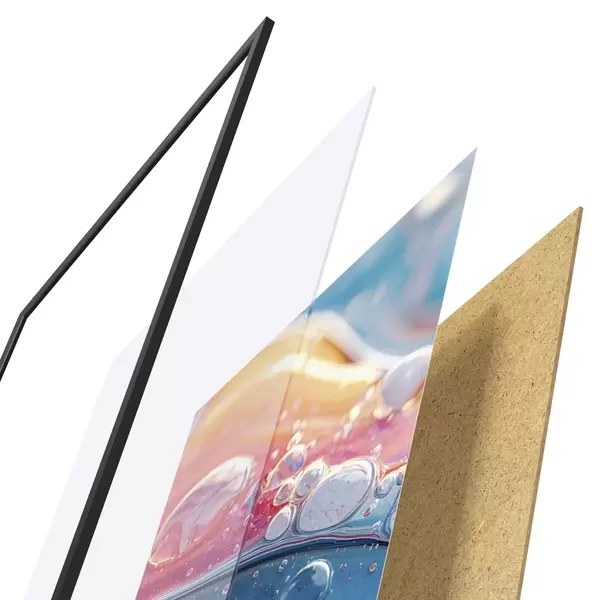 Das Poster besteht aus einem Rahmen, Plexiglas, einem gedruckten Bild und einer Rückwand aus Spanplatten. Dank der Halterungen auf der Rückseite kann das Poster sofort an die Wand gehängt werden.