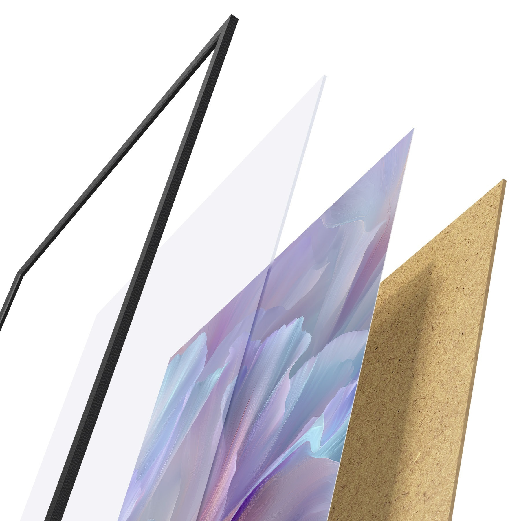 Das Poster besteht aus einem Rahmen, Plexiglas, einem gedruckten Bild und einer Rückwand aus Spanplatten. Dank der Halterungen auf der Rückseite kann das Poster sofort an die Wand gehängt werden.