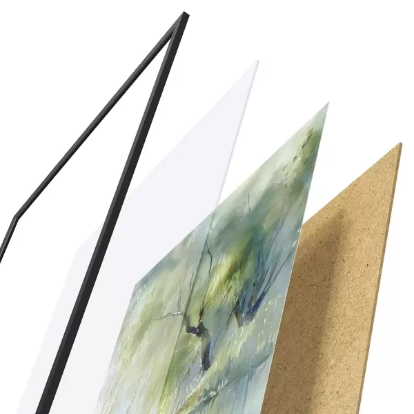 Das Poster besteht aus einem Rahmen, Plexiglas, einem gedruckten Bild und einer Rückwand aus Spanplatten. Dank der Halterungen auf der Rückseite kann das Poster sofort an die Wand gehängt werden.