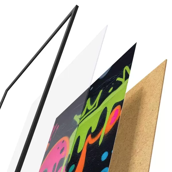 Das Poster besteht aus einem Rahmen, Plexiglas, einem gedruckten Bild und einer Rückwand aus Spanplatten. Dank der Halterungen auf der Rückseite kann das Poster sofort an die Wand gehängt werden.