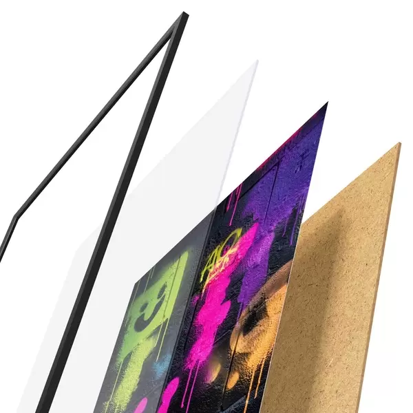 Das Poster besteht aus einem Rahmen, Plexiglas, einem gedruckten Bild und einer Rückwand aus Spanplatten. Dank der Halterungen auf der Rückseite kann das Poster sofort an die Wand gehängt werden.