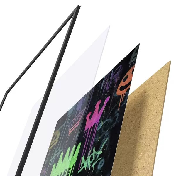Das Poster besteht aus einem Rahmen, Plexiglas, einem gedruckten Bild und einer Rückwand aus Spanplatten. Dank der Halterungen auf der Rückseite kann das Poster sofort an die Wand gehängt werden.