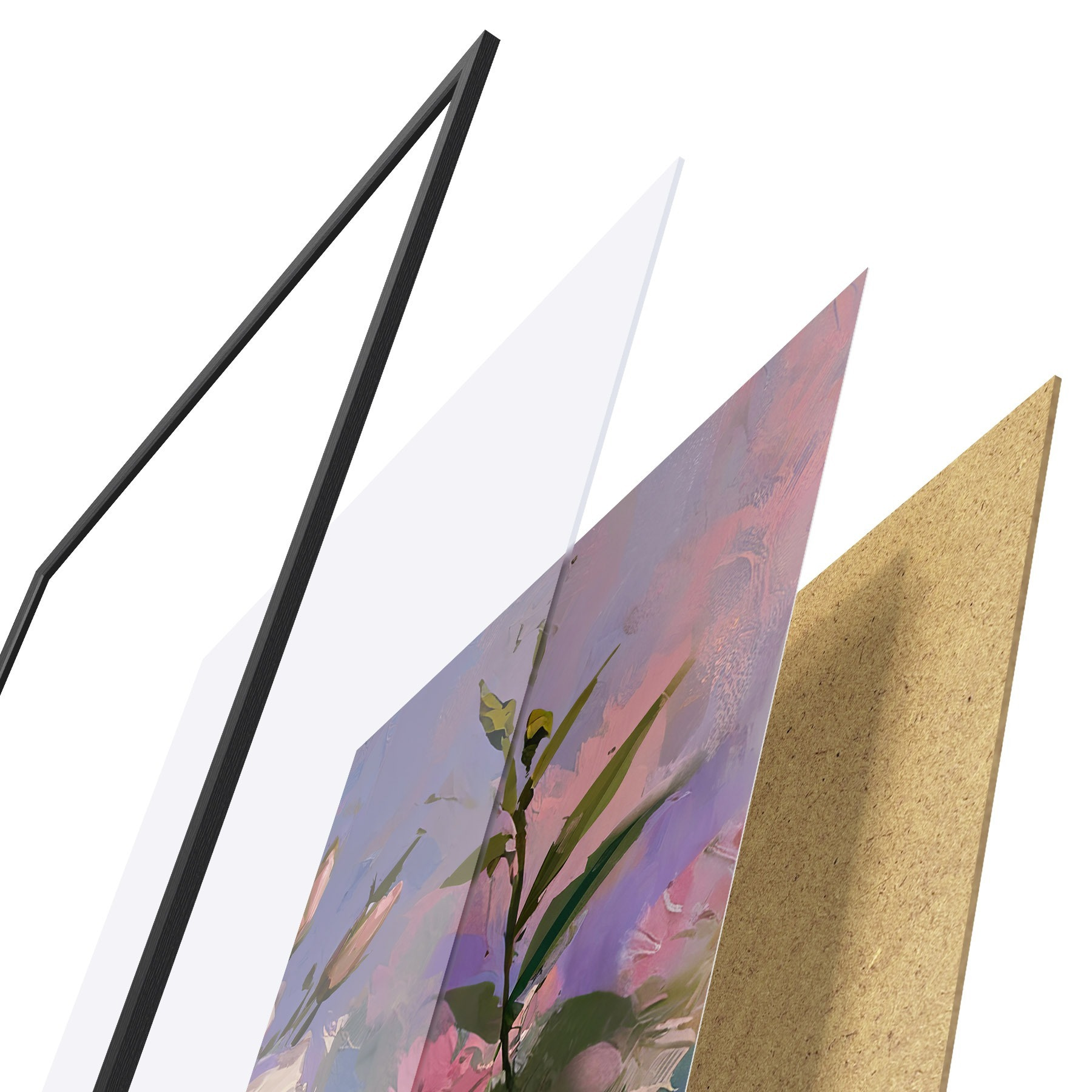 Das Poster besteht aus einem Rahmen, Plexiglas, einem gedruckten Bild und einer Rückwand aus Spanplatten. Dank der Halterungen auf der Rückseite kann das Poster sofort an die Wand gehängt werden.