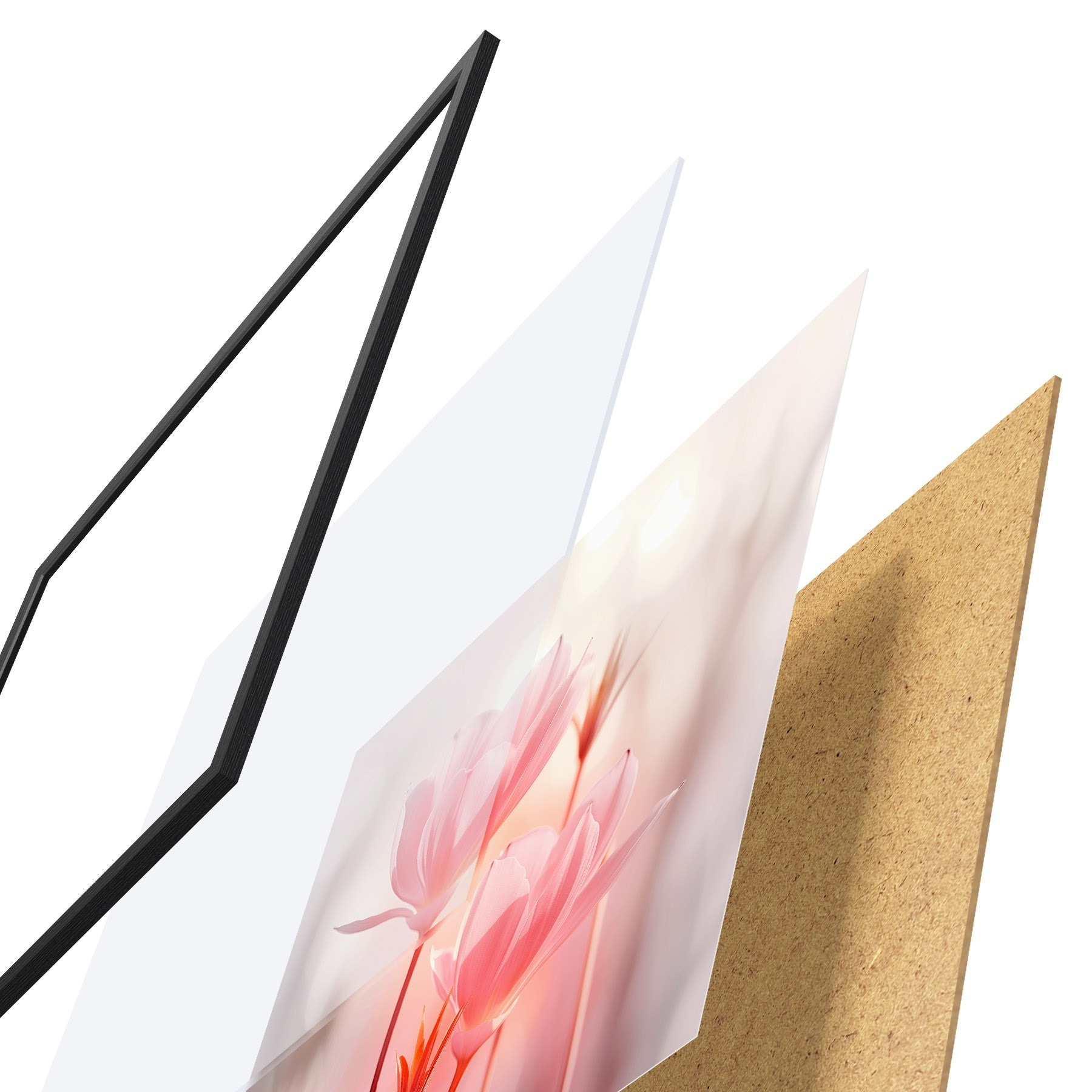 Das Poster besteht aus einem Rahmen, Plexiglas, einem gedruckten Bild und einer Rückwand aus Spanplatten. Dank der Halterungen auf der Rückseite kann das Poster sofort an die Wand gehängt werden.
