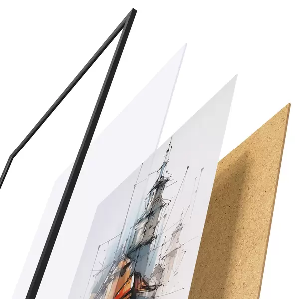 Das Poster besteht aus einem Rahmen, Plexiglas, einem gedruckten Bild und einer Rückwand aus Spanplatten. Dank der Halterungen auf der Rückseite kann das Poster sofort an die Wand gehängt werden.