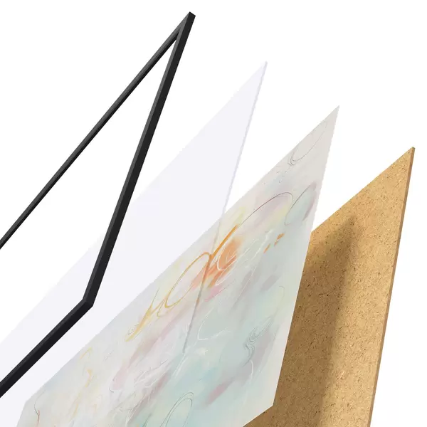 Das Poster besteht aus einem Rahmen, Plexiglas, einem gedruckten Bild und einer Rückwand aus Spanplatten. Dank der Halterungen auf der Rückseite kann das Poster sofort an die Wand gehängt werden.