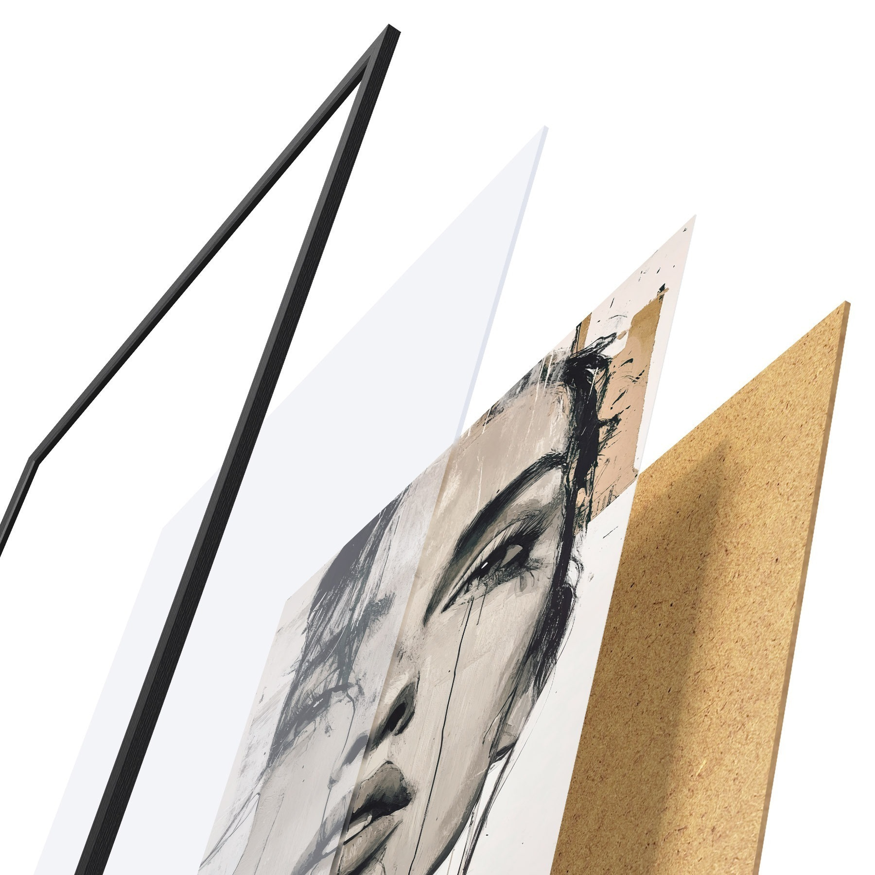 Das Poster besteht aus einem Rahmen, Plexiglas, einem gedruckten Bild und einer Rückwand aus Spanplatten. Dank der Halterungen auf der Rückseite kann das Poster sofort an die Wand gehängt werden.