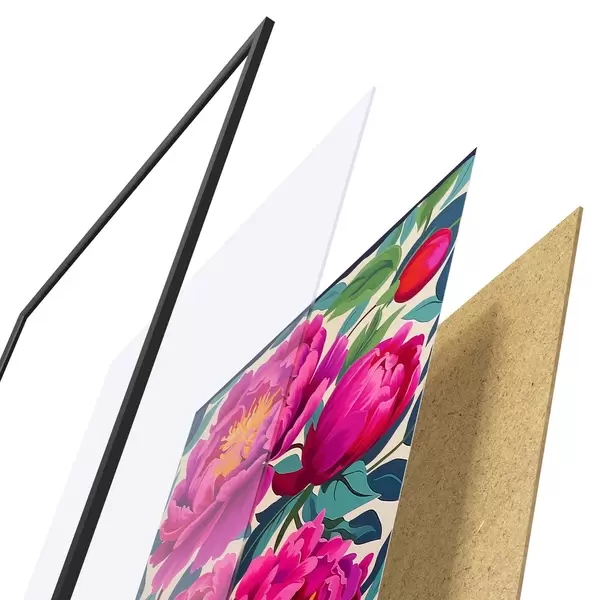 Das Poster besteht aus einem Rahmen, Plexiglas, einem gedruckten Bild und einer Rückwand aus Spanplatten. Dank der Halterungen auf der Rückseite kann das Poster sofort an die Wand gehängt werden.