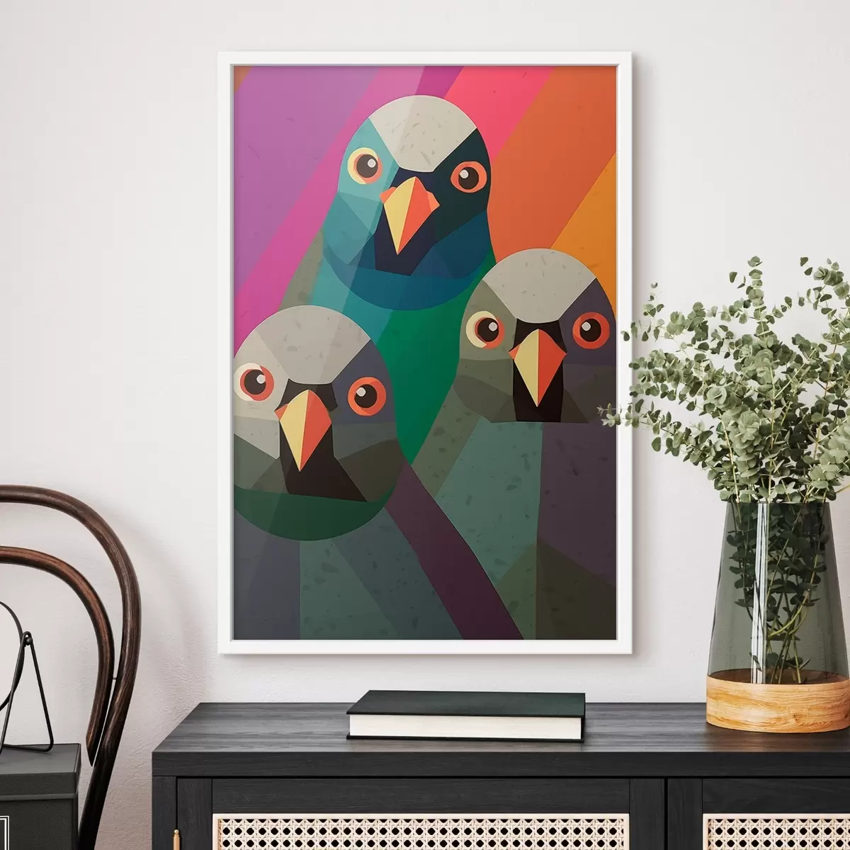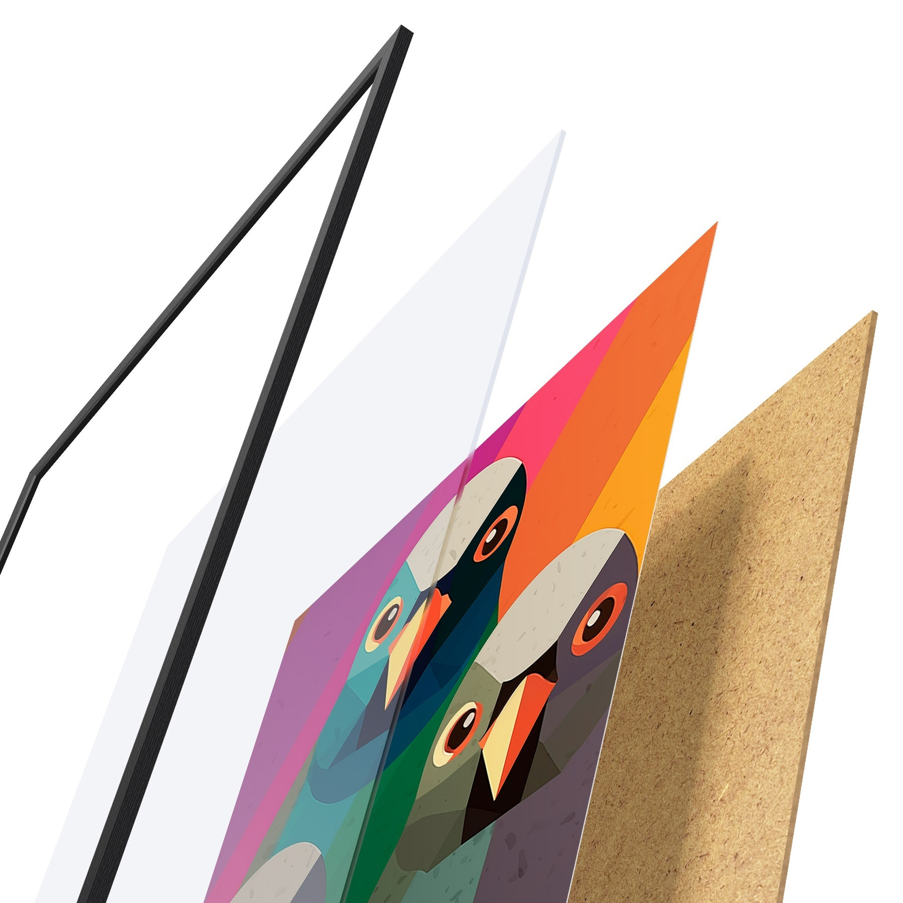 Das Poster besteht aus einem Rahmen, Plexiglas, einem gedruckten Bild und einer Rückwand aus Spanplatten. Dank der Halterungen auf der Rückseite kann das Poster sofort an die Wand gehängt werden.