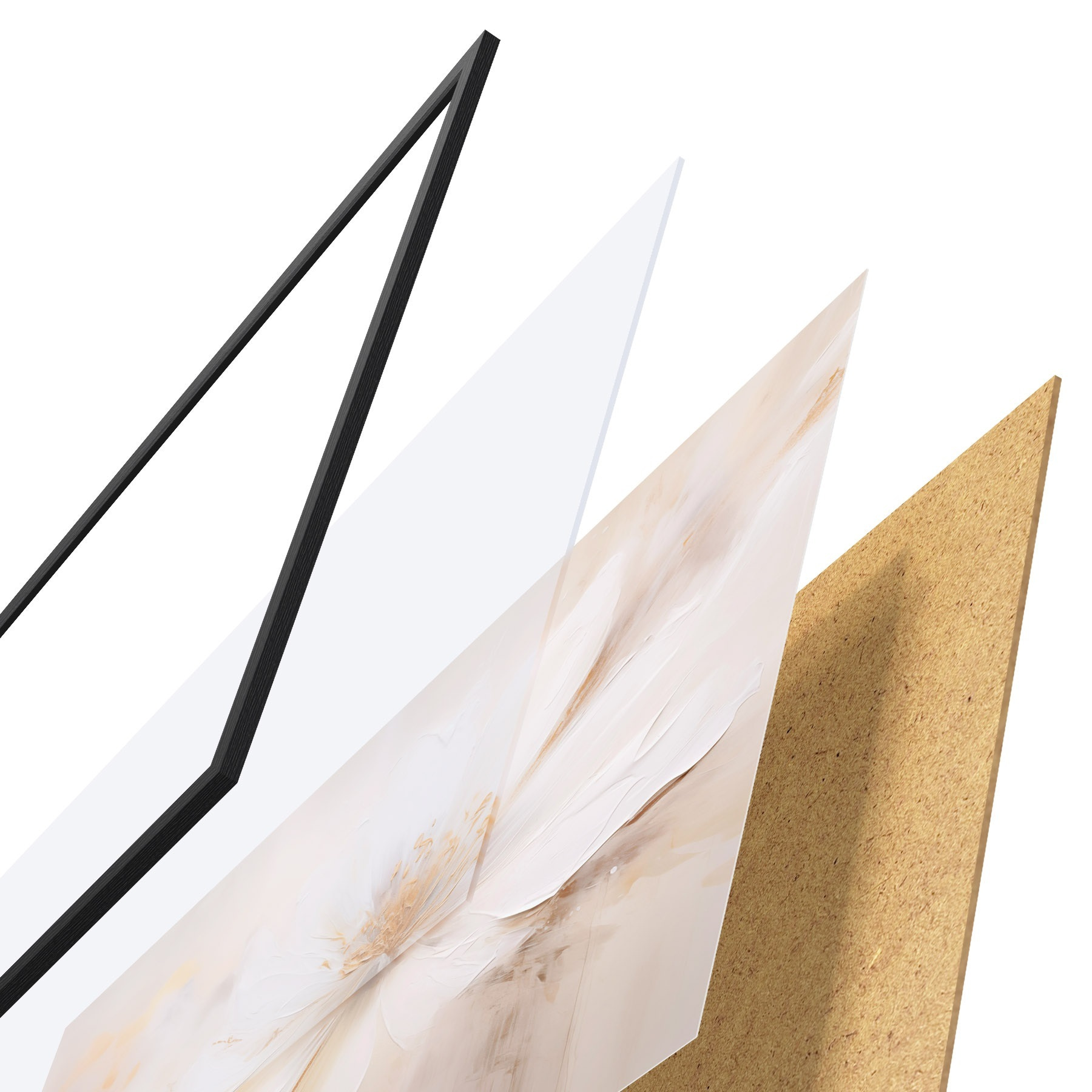 Das Poster besteht aus einem Rahmen, Plexiglas, einem gedruckten Bild und einer Rückwand aus Spanplatten. Dank der Halterungen auf der Rückseite kann das Poster sofort an die Wand gehängt werden.