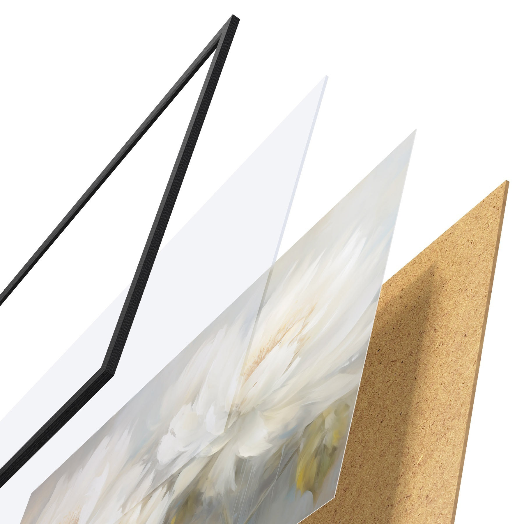 Das Poster besteht aus einem Rahmen, Plexiglas, einem gedruckten Bild und einer Rückwand aus Spanplatten. Dank der Halterungen auf der Rückseite kann das Poster sofort an die Wand gehängt werden.