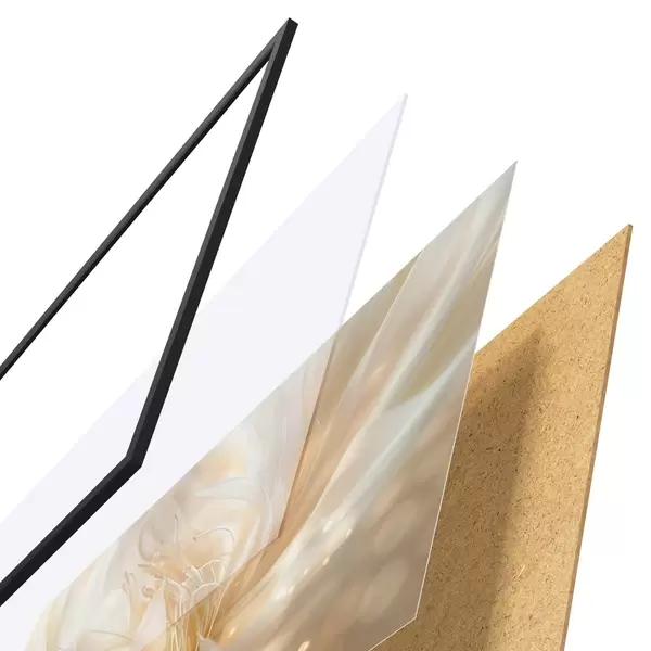 Das Poster besteht aus einem Rahmen, Plexiglas, einem gedruckten Bild und einer Rückwand aus Spanplatten. Dank der Halterungen auf der Rückseite kann das Poster sofort an die Wand gehängt werden.