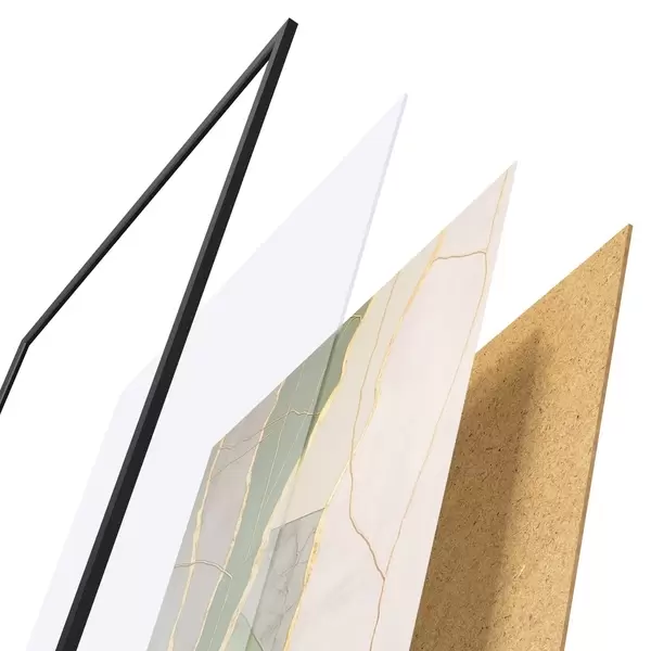 Das Poster besteht aus einem Rahmen, Plexiglas, einem gedruckten Bild und einer Rückwand aus Spanplatten. Dank der Halterungen auf der Rückseite kann das Poster sofort an die Wand gehängt werden.