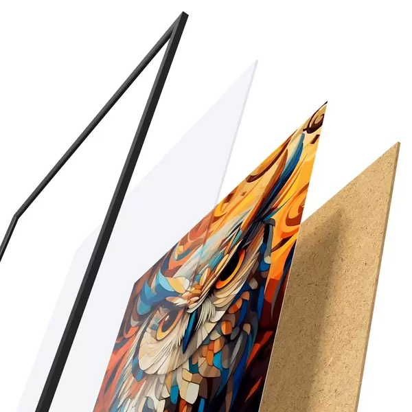Das Poster besteht aus einem Rahmen, Plexiglas, einem gedruckten Bild und einer Rückwand aus Spanplatten. Dank der Halterungen auf der Rückseite kann das Poster sofort an die Wand gehängt werden.