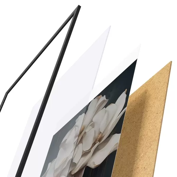 Das Poster besteht aus einem Rahmen, Plexiglas, einem gedruckten Bild und einer Rückwand aus Spanplatten. Dank der Halterungen auf der Rückseite kann das Poster sofort an die Wand gehängt werden.