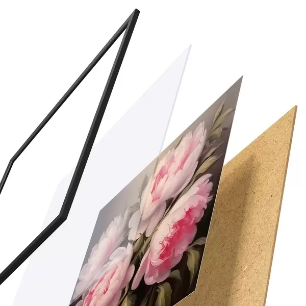 Das Poster besteht aus einem Rahmen, Plexiglas, einem gedruckten Bild und einer Rückwand aus Spanplatten. Dank der Halterungen auf der Rückseite kann das Poster sofort an die Wand gehängt werden.