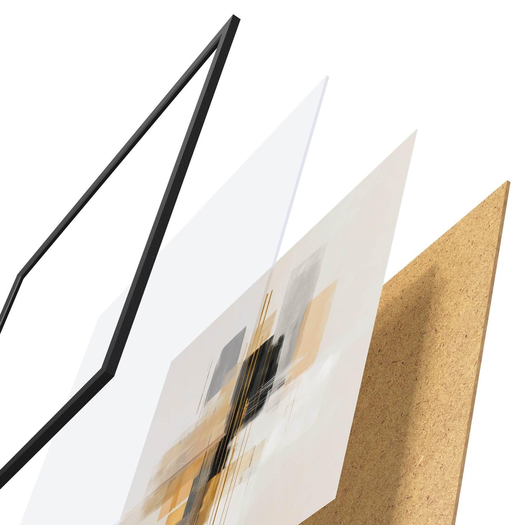 Das Poster besteht aus einem Rahmen, Plexiglas, einem gedruckten Bild und einer Rückwand aus Spanplatten. Dank der Halterungen auf der Rückseite kann das Poster sofort an die Wand gehängt werden.