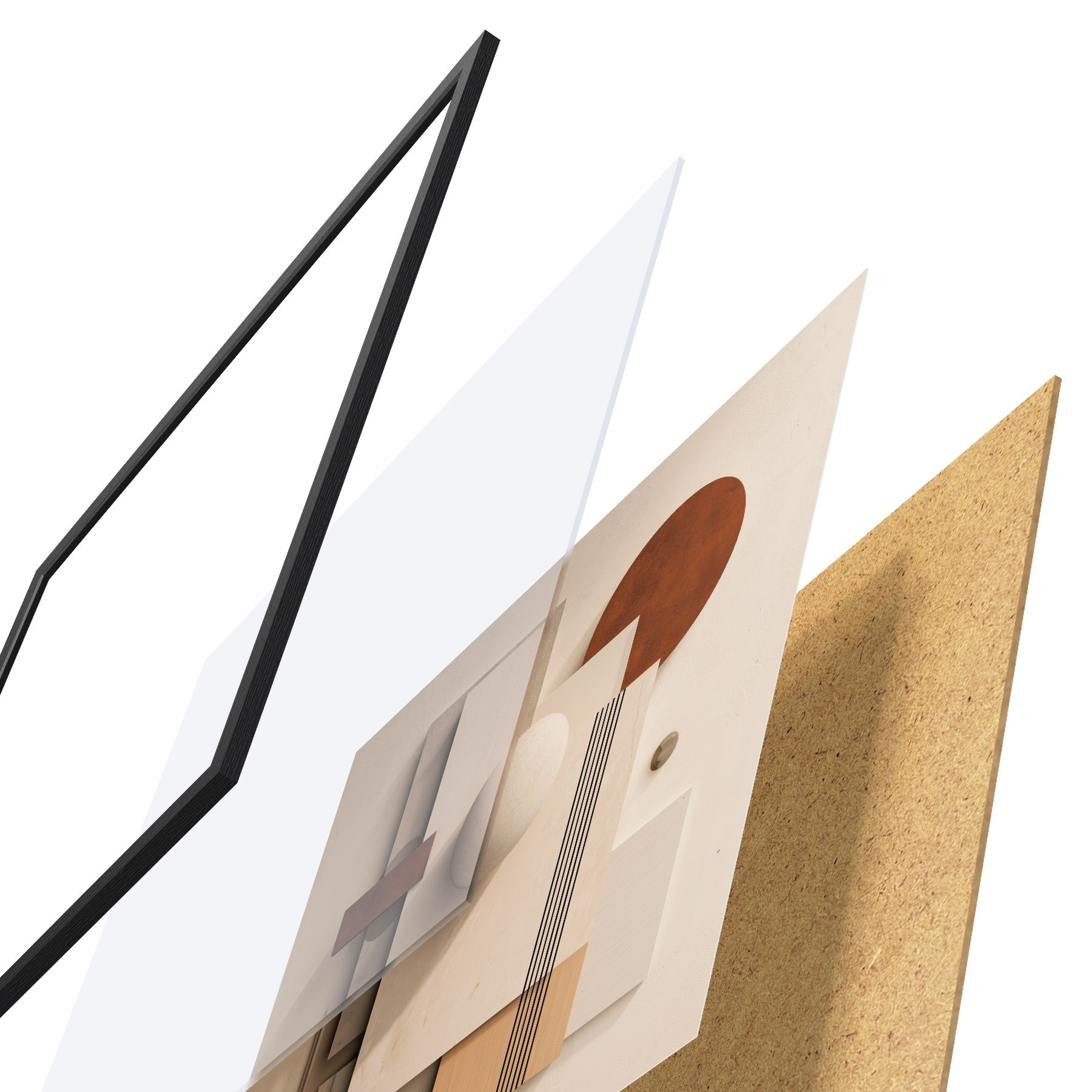Das Poster besteht aus einem Rahmen, Plexiglas, einem gedruckten Bild und einer Rückwand aus Spanplatten. Dank der Halterungen auf der Rückseite kann das Poster sofort an die Wand gehängt werden.