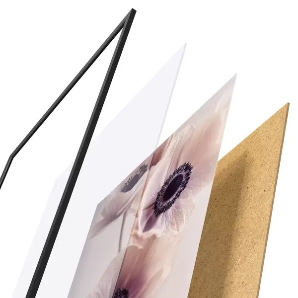 Das Poster besteht aus einem Rahmen, Plexiglas, einem gedruckten Bild und einer Rückwand aus Spanplatten. Dank der Halterungen auf der Rückseite kann das Poster sofort an die Wand gehängt werden.