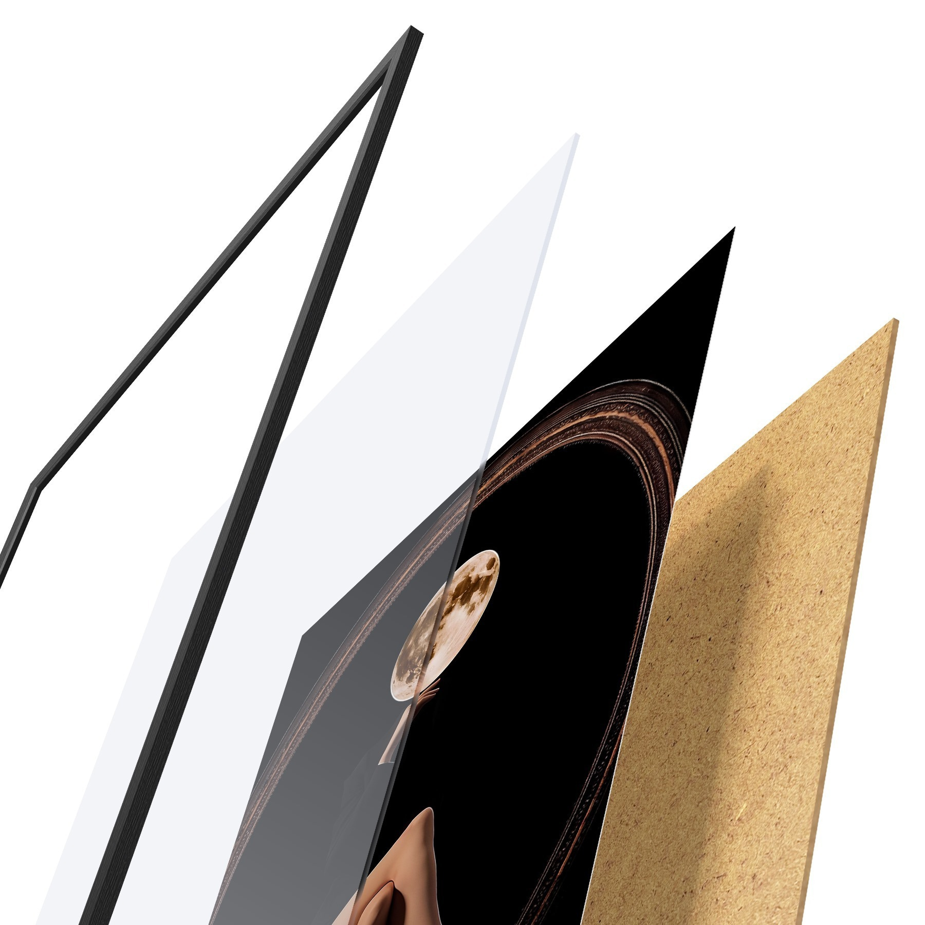 Das Poster besteht aus einem Rahmen, Plexiglas, einem gedruckten Bild und einer Rückwand aus Spanplatten. Dank der Halterungen auf der Rückseite kann das Poster sofort an die Wand gehängt werden.