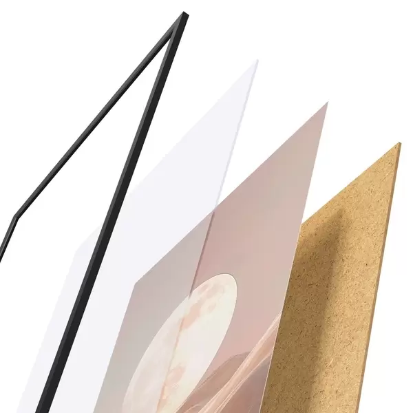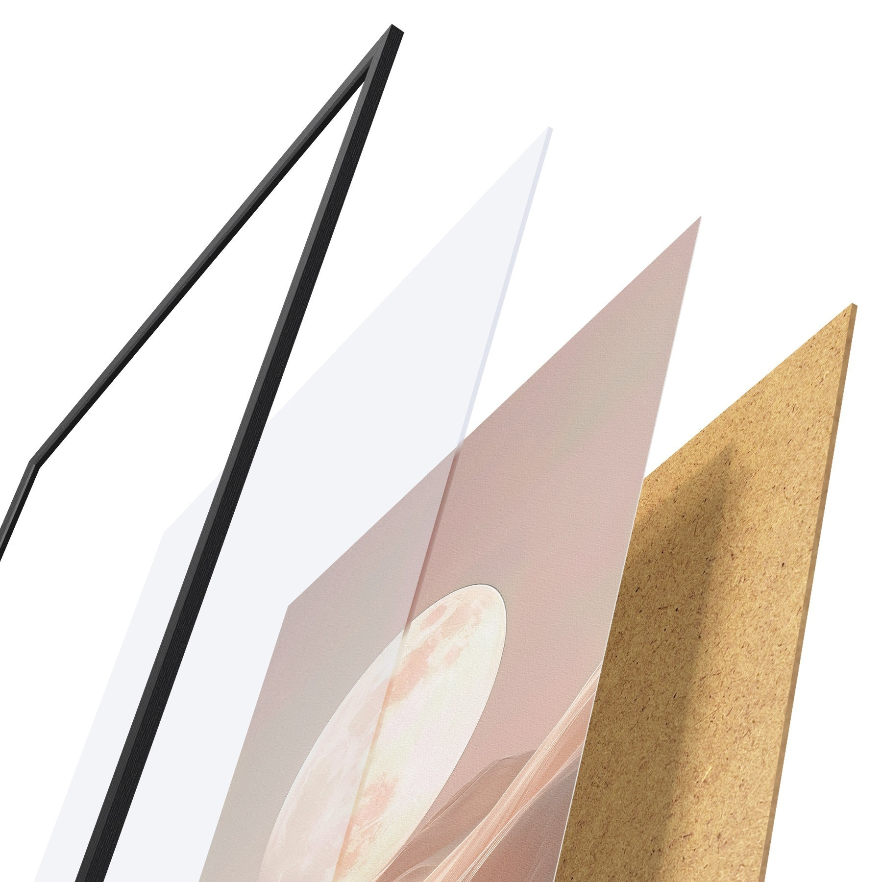 Das Poster besteht aus einem Rahmen, Plexiglas, einem gedruckten Bild und einer Rückwand aus Spanplatten. Dank der Halterungen auf der Rückseite kann das Poster sofort an die Wand gehängt werden.