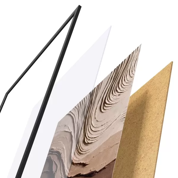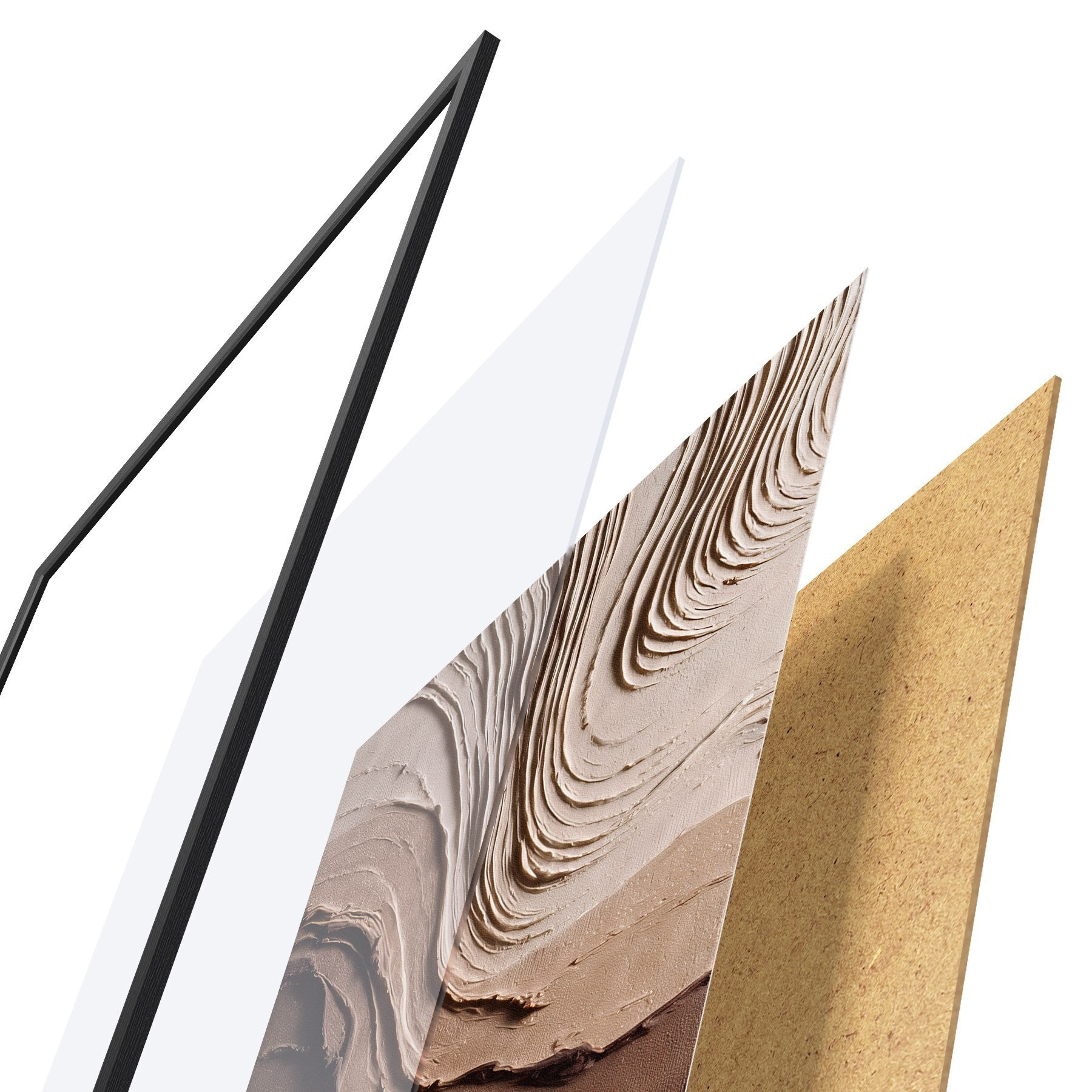 Das Poster besteht aus einem Rahmen, Plexiglas, einem gedruckten Bild und einer Rückwand aus Spanplatten. Dank der Halterungen auf der Rückseite kann das Poster sofort an die Wand gehängt werden.