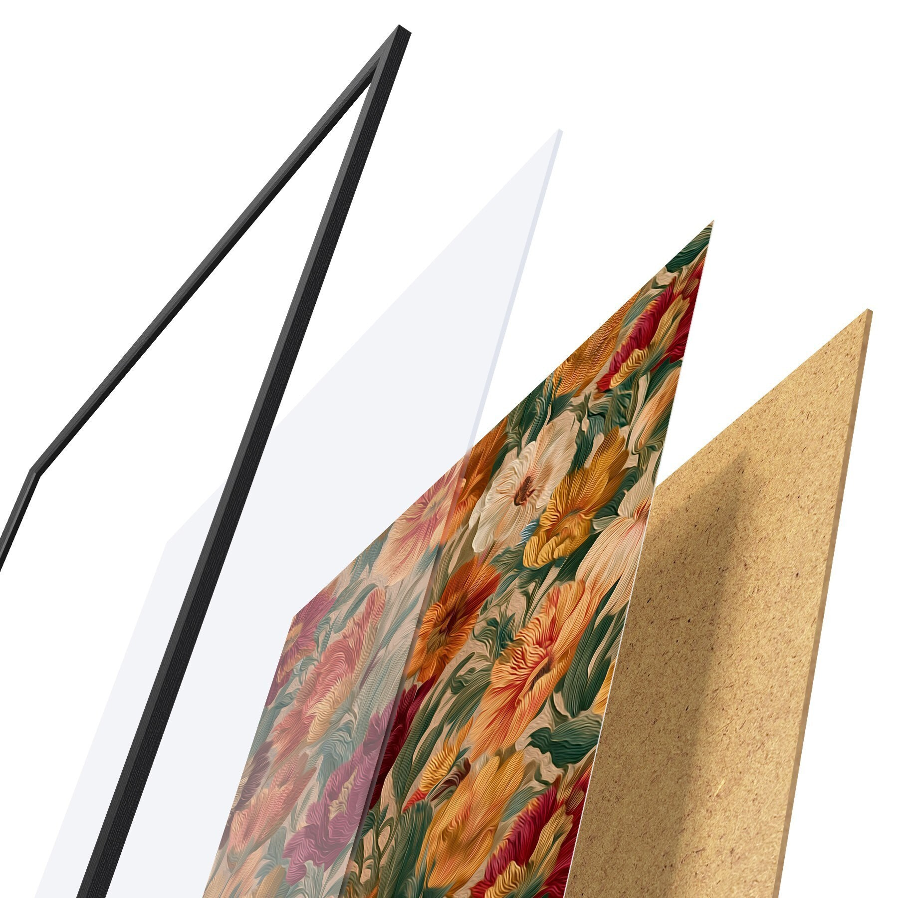 Das Poster besteht aus einem Rahmen, Plexiglas, einem gedruckten Bild und einer Rückwand aus Spanplatten. Dank der Halterungen auf der Rückseite kann das Poster sofort an die Wand gehängt werden.