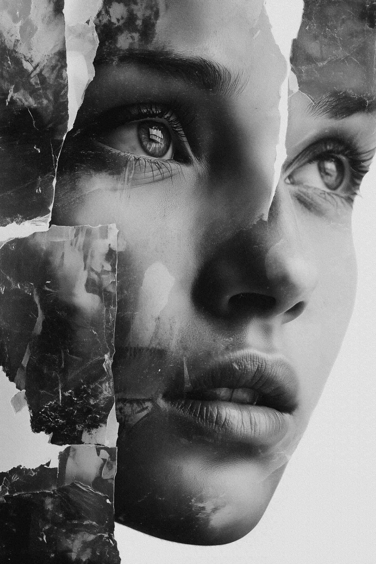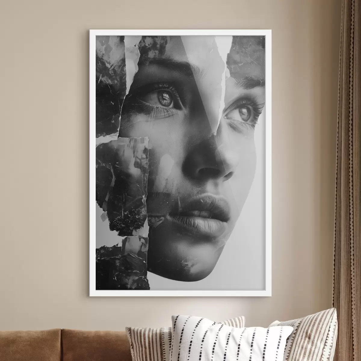 Poster Schwarz-Weiß-Collage-Porträt mit zerrissenen strukturierten Schichten Nr f45898