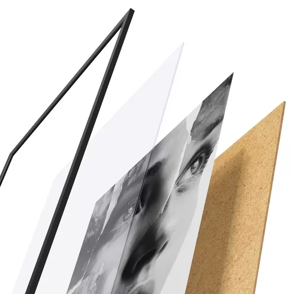 Das Poster besteht aus einem Rahmen, Plexiglas, einem gedruckten Bild und einer Rückwand aus Spanplatten. Dank der Halterungen auf der Rückseite kann das Poster sofort an die Wand gehängt werden.