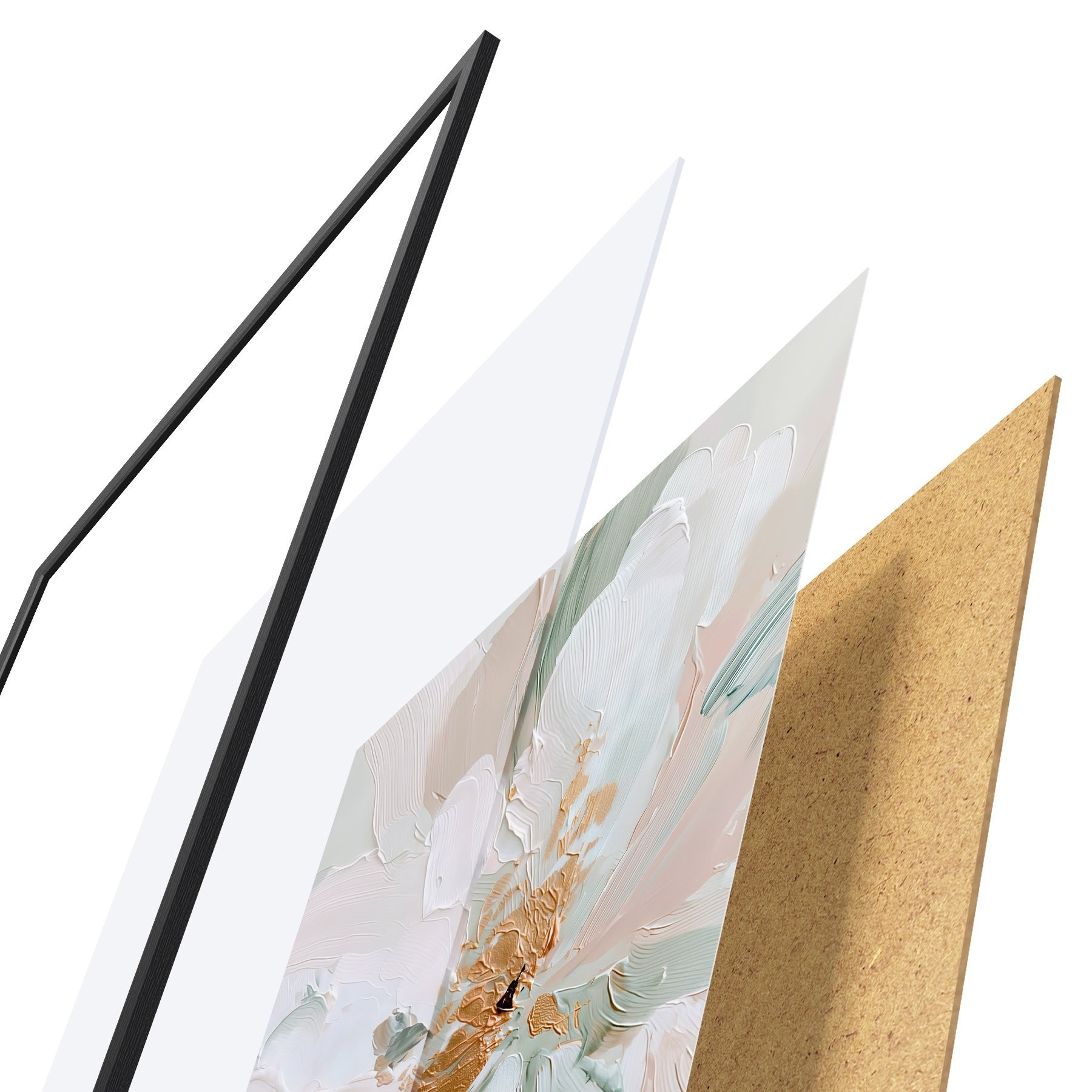 Das Poster besteht aus einem Rahmen, Plexiglas, einem gedruckten Bild und einer Rückwand aus Spanplatten. Dank der Halterungen auf der Rückseite kann das Poster sofort an die Wand gehängt werden.