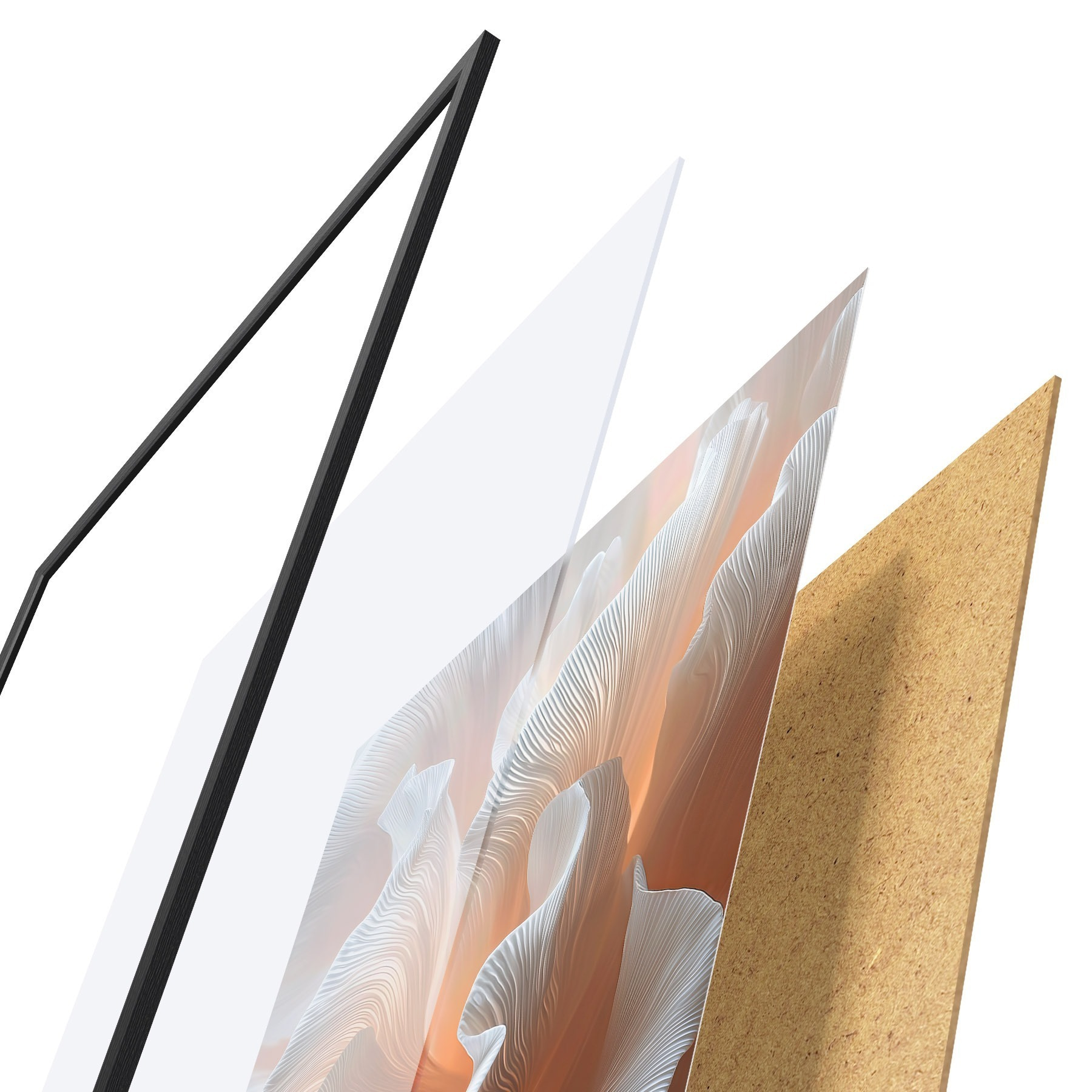 Das Poster besteht aus einem Rahmen, Plexiglas, einem gedruckten Bild und einer Rückwand aus Spanplatten. Dank der Halterungen auf der Rückseite kann das Poster sofort an die Wand gehängt werden.