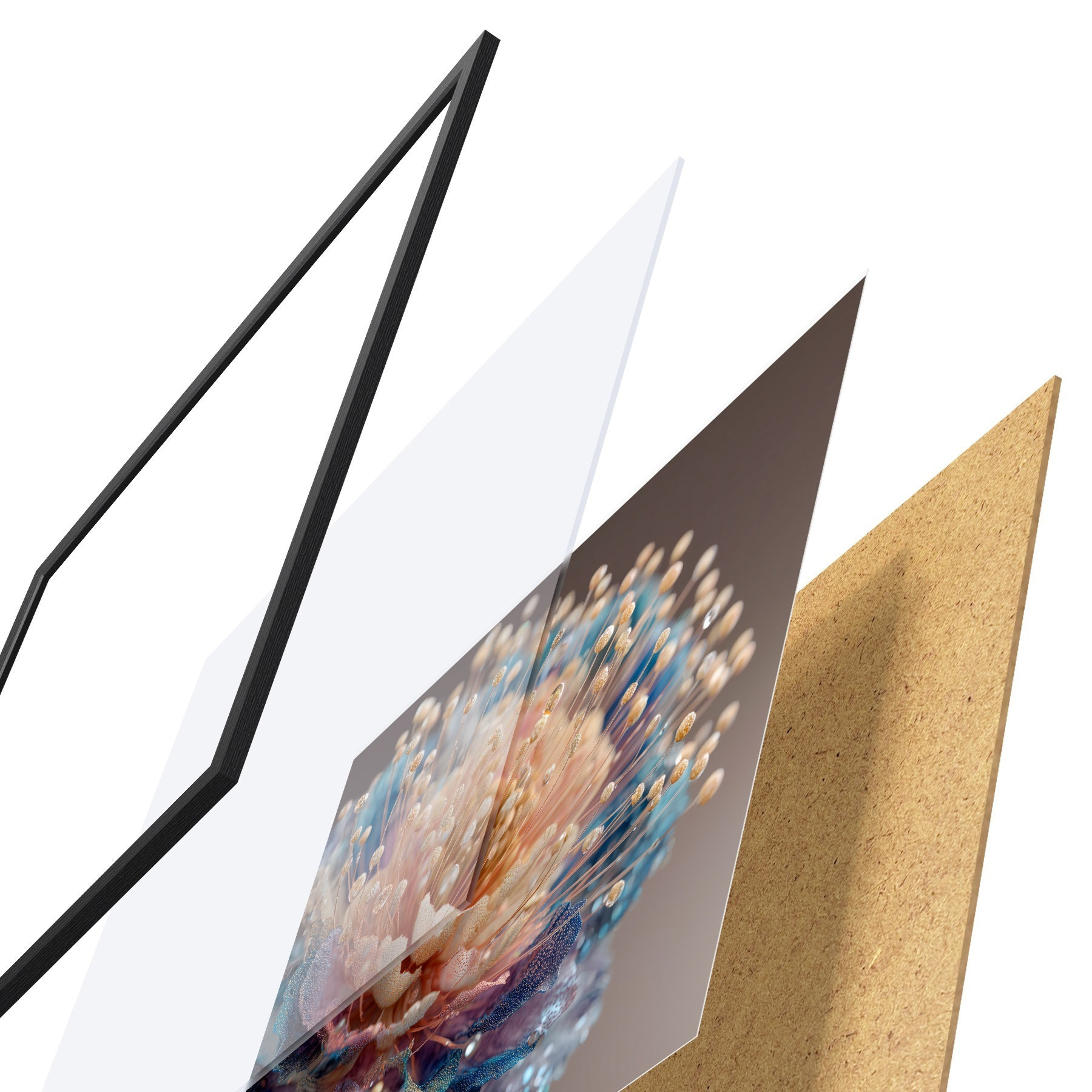 Das Poster besteht aus einem Rahmen, Plexiglas, einem gedruckten Bild und einer Rückwand aus Spanplatten. Dank der Halterungen auf der Rückseite kann das Poster sofort an die Wand gehängt werden.