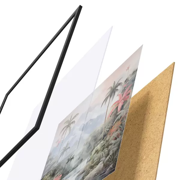 Das Poster besteht aus einem Rahmen, Plexiglas, einem gedruckten Bild und einer Rückwand aus Spanplatten. Dank der Halterungen auf der Rückseite kann das Poster sofort an die Wand gehängt werden.