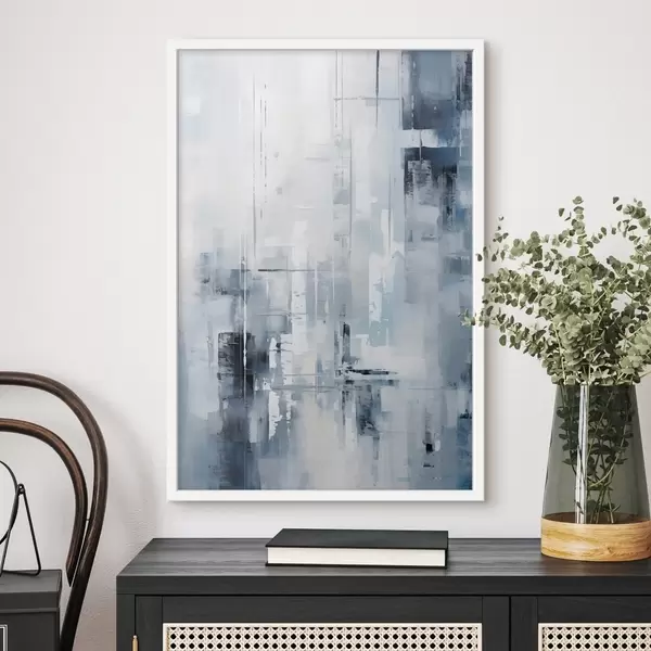 Poster Abstrakte Malerei-Imitation mit blauen, grauen und weißen Farben, vertikalen Linien und geometrischen Formen f45927