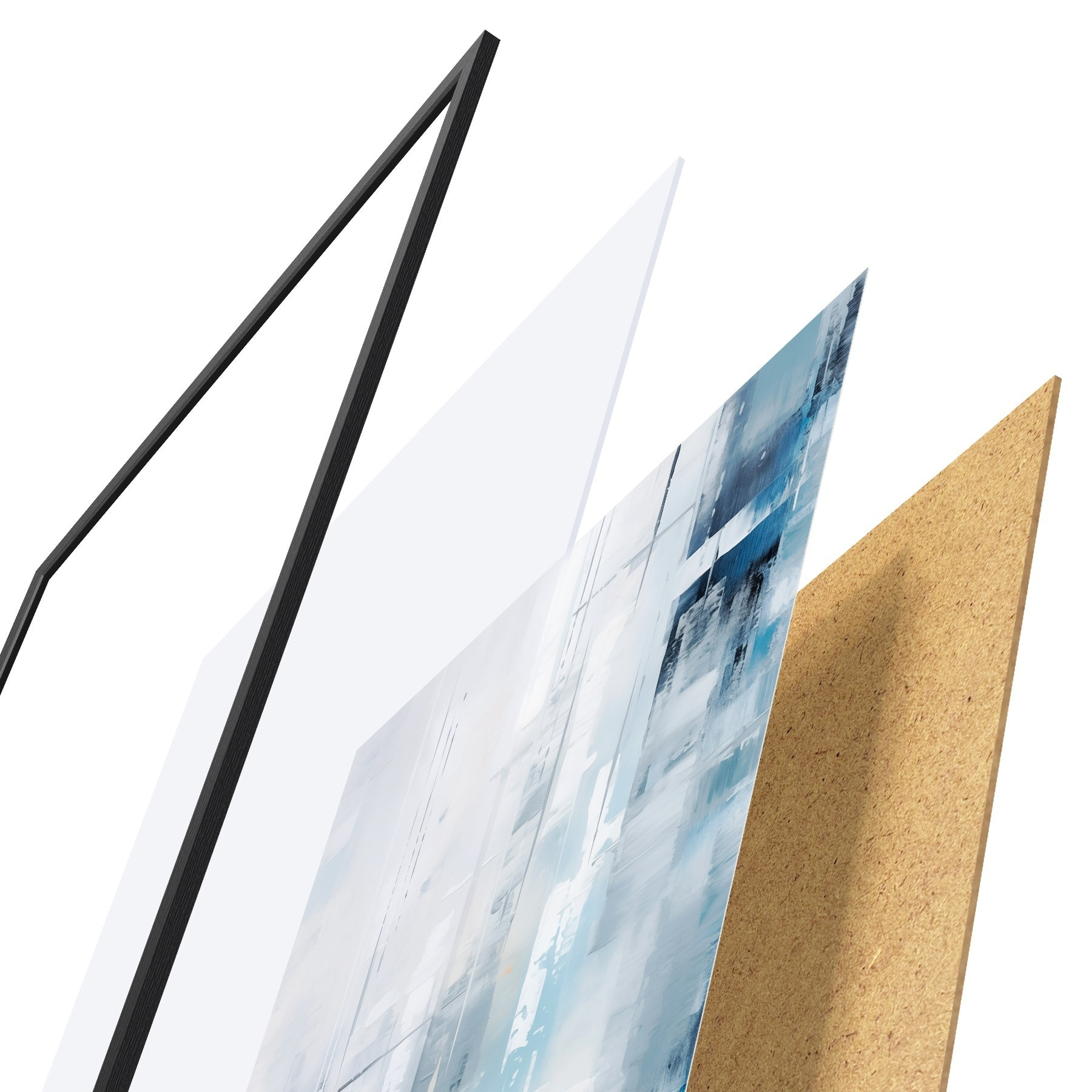 Das Poster besteht aus einem Rahmen, Plexiglas, einem gedruckten Bild und einer Rückwand aus Spanplatten. Dank der Halterungen auf der Rückseite kann das Poster sofort an die Wand gehängt werden.