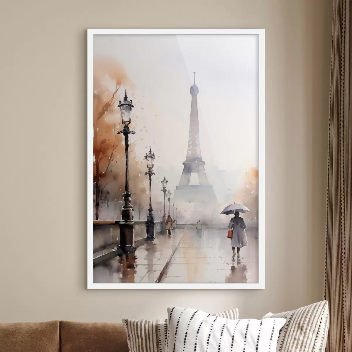 Poster Ein regnerischer Tag in Paris mit dem Eiffelturm im Hintergrund und Vintage-Straßenlaternen f45930