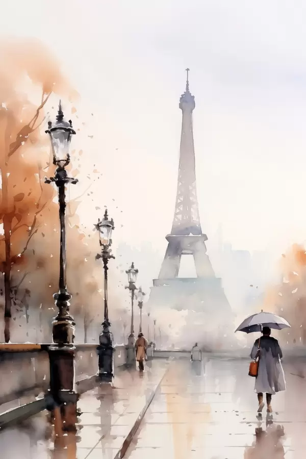 Poster Ein regnerischer Tag in Paris mit dem Eiffelturm im Hintergrund und Vintage-Straßenlaternen f45930