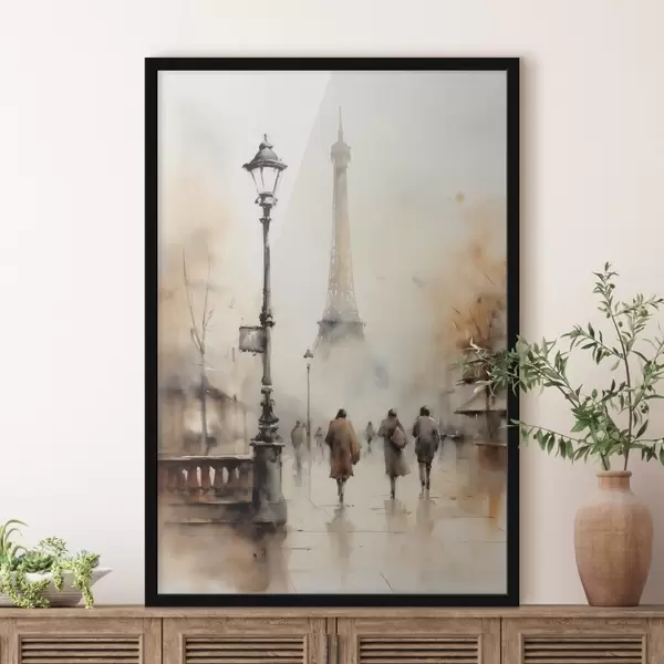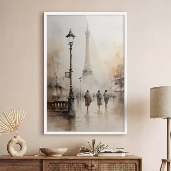 Poster Ein regnerischer Herbsttag in Paris mit dem Eiffelturm im Hintergrund und Vintage-Straßenlaternen f45931