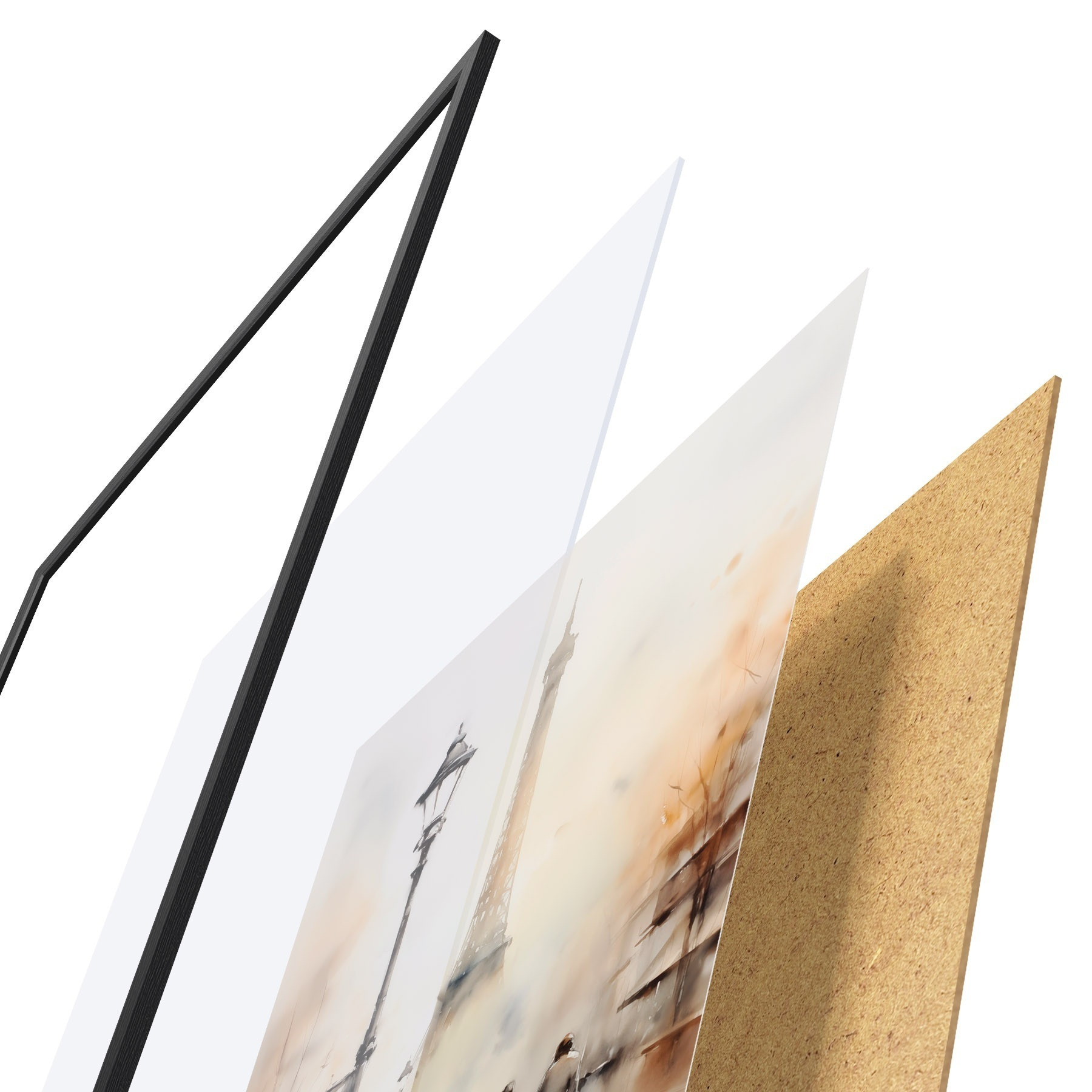 Das Poster besteht aus einem Rahmen, Plexiglas, einem gedruckten Bild und einer Rückwand aus Spanplatten. Dank der Halterungen auf der Rückseite kann das Poster sofort an die Wand gehängt werden.