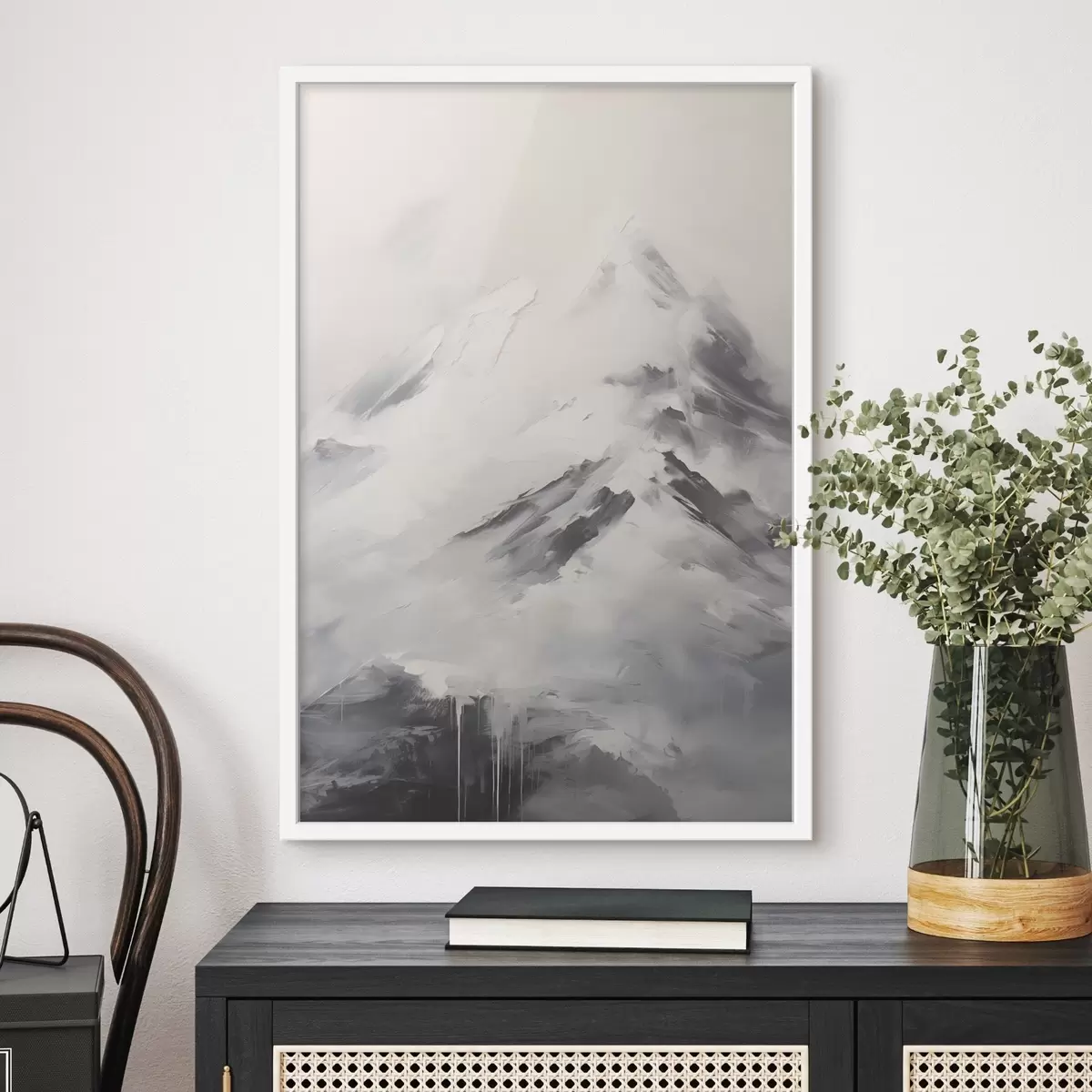 Poster Verschneite Berggipfel mit grauen Schatten, grauer Himmel, Pinselstriche, strukturiert, minimalistisch Nr f45932