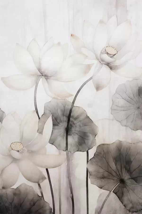 Poster Weiße Lotusblumen mit dunkler Blattstruktur, heller Hintergrund, minimalistisches Design Nr f45937