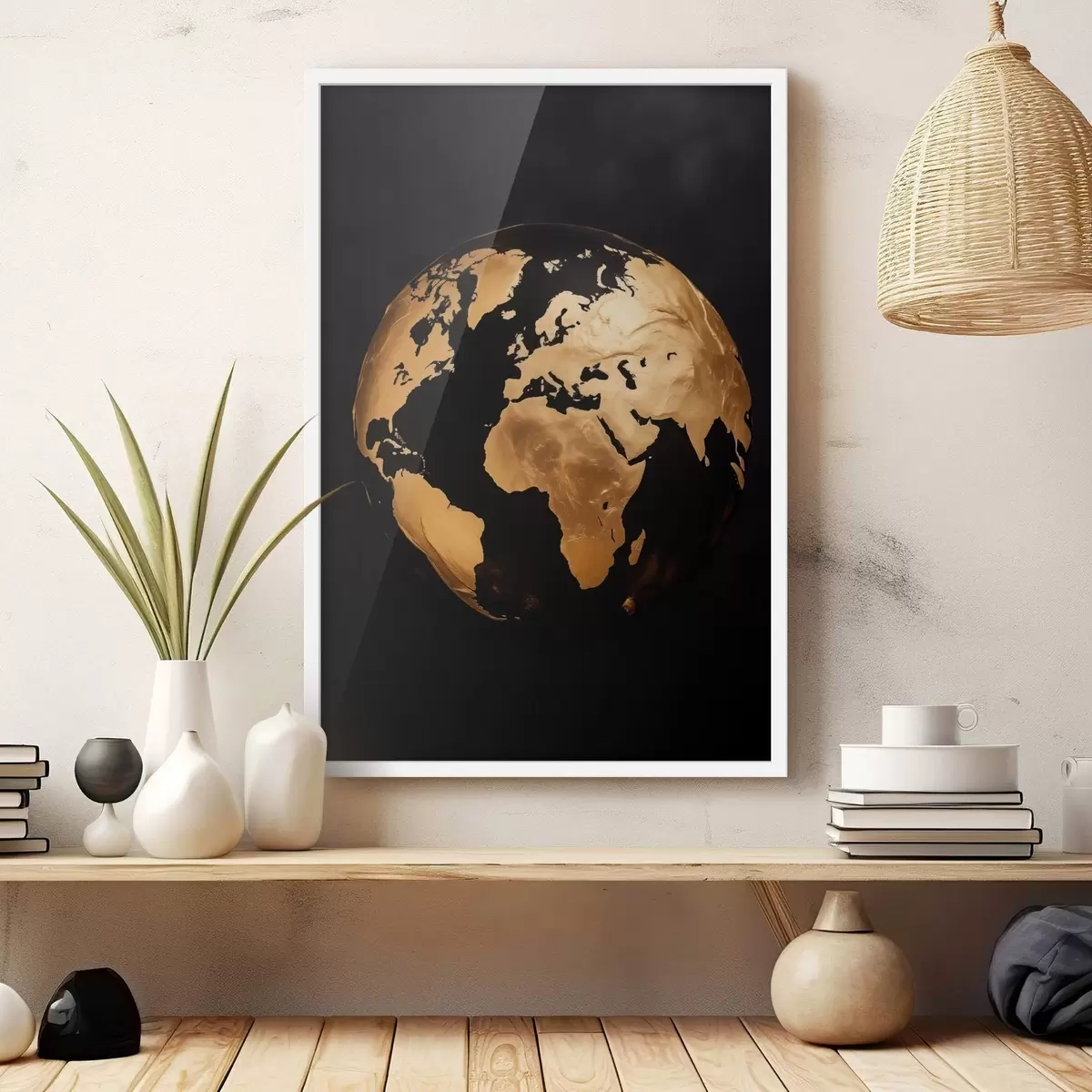 Poster Gelber strukturierter abstrakter Erdglobus, Planet auf schwarzem Hintergrund, moderne minimalistische Kunst Nr f45942