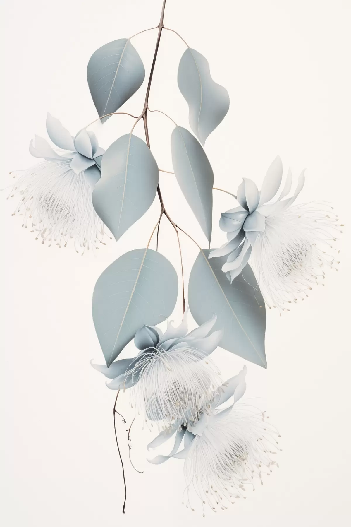Poster Eukalyptuszweig mit blauen Blättern und weißen Blüten, heller Hintergrund Nr f45947