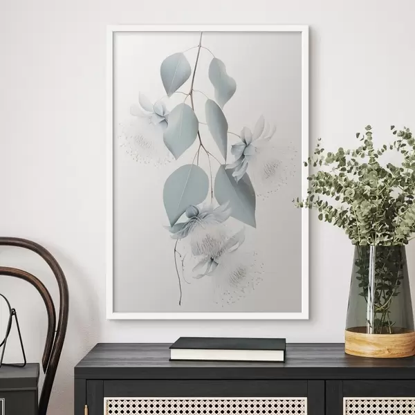 Poster Eukalyptuszweig mit blauen Blättern und weißen Blüten, heller Hintergrund f45947