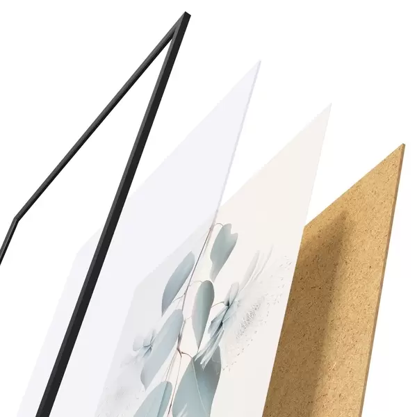 Das Poster besteht aus einem Rahmen, Plexiglas, einem gedruckten Bild und einer Rückwand aus Spanplatten. Dank der Halterungen auf der Rückseite kann das Poster sofort an die Wand gehängt werden.