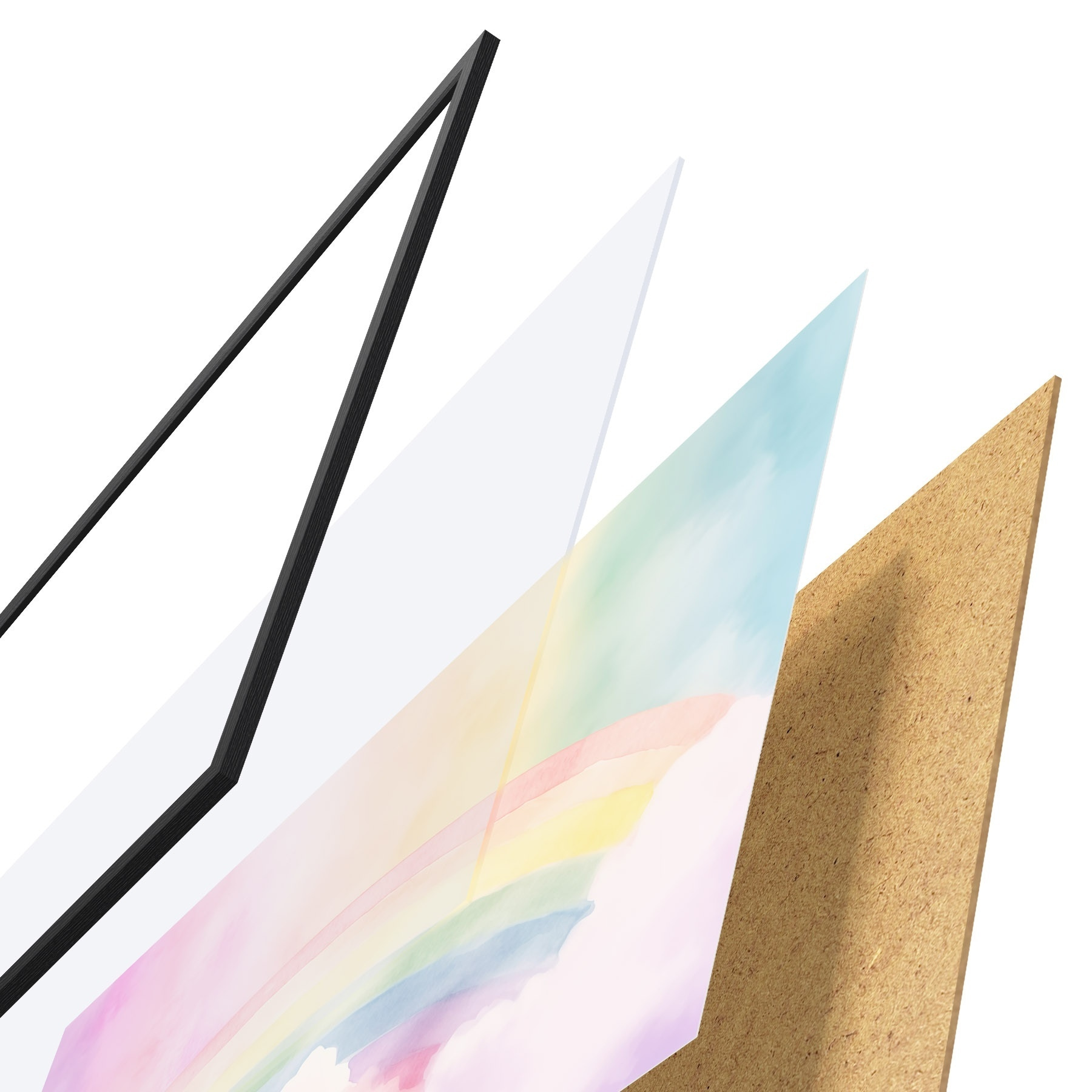 Das Poster besteht aus einem Rahmen, Plexiglas, einem gedruckten Bild und einer Rückwand aus Spanplatten. Dank der Halterungen auf der Rückseite kann das Poster sofort an die Wand gehängt werden.