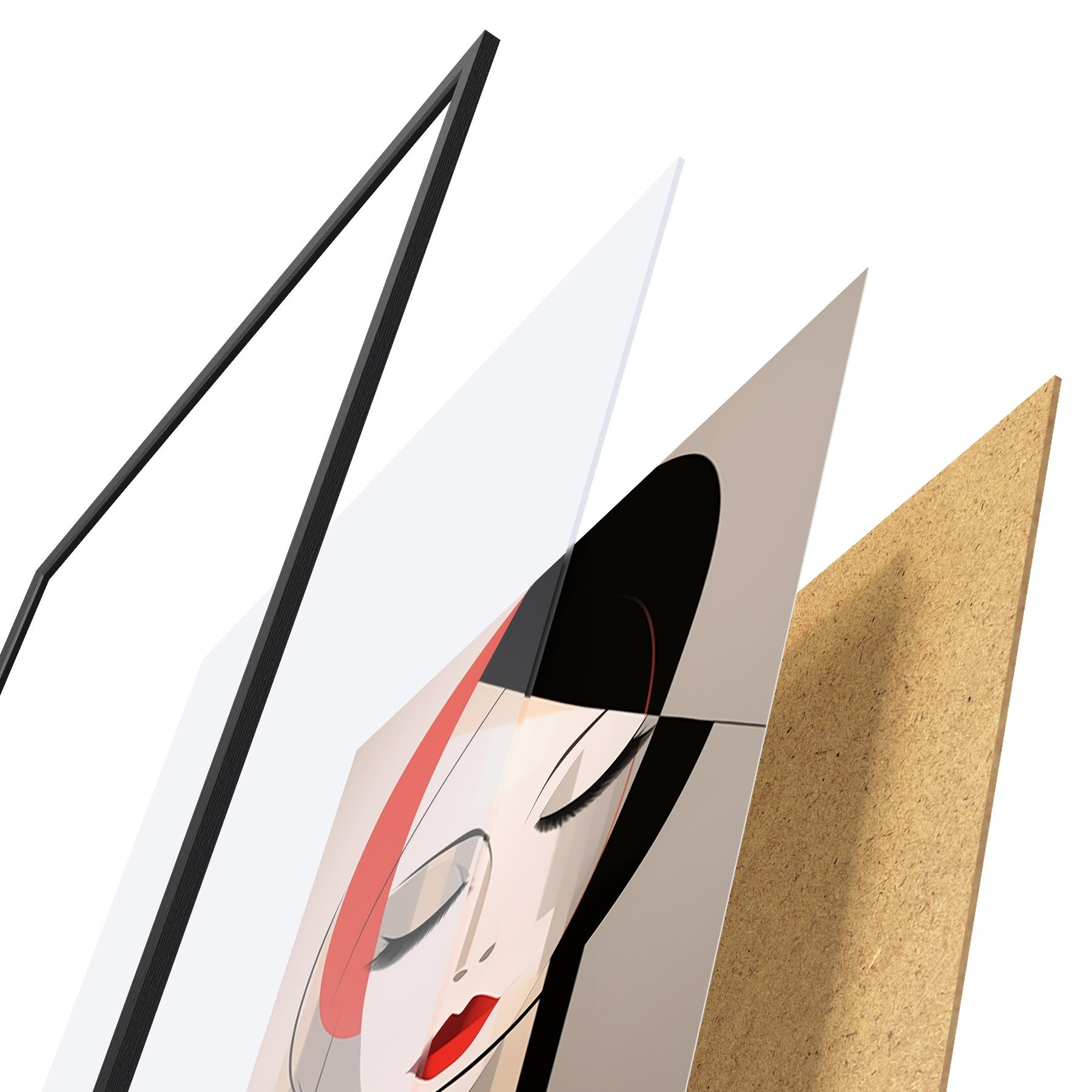 Das Poster besteht aus einem Rahmen, Plexiglas, einem gedruckten Bild und einer Rückwand aus Spanplatten. Dank der Halterungen auf der Rückseite kann das Poster sofort an die Wand gehängt werden.